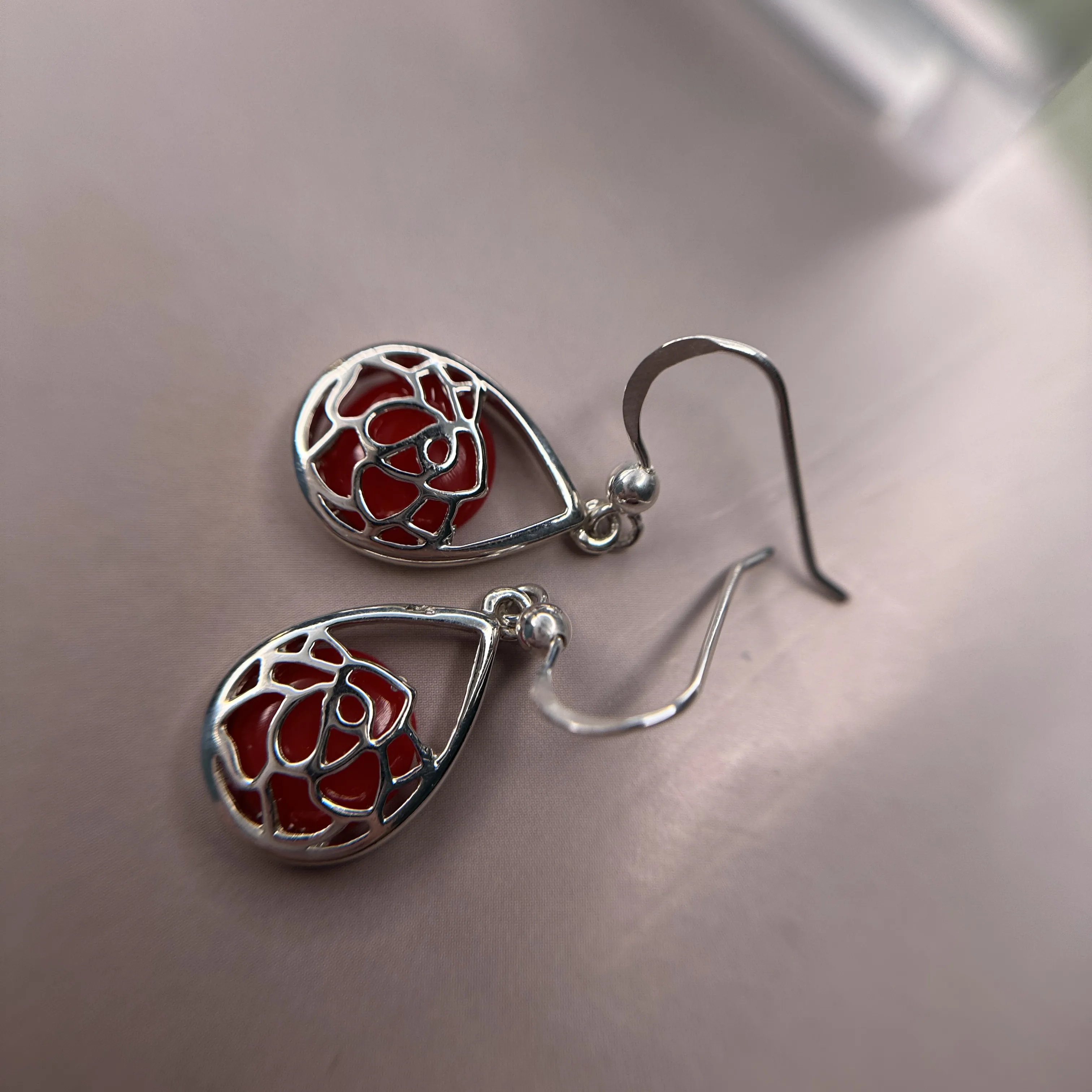 Cercei din argint model floare trandafir si piatra rosie.