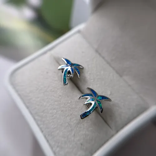 Cercei din argint model palmier cu opal albastru. Inchizatoare cu surub.