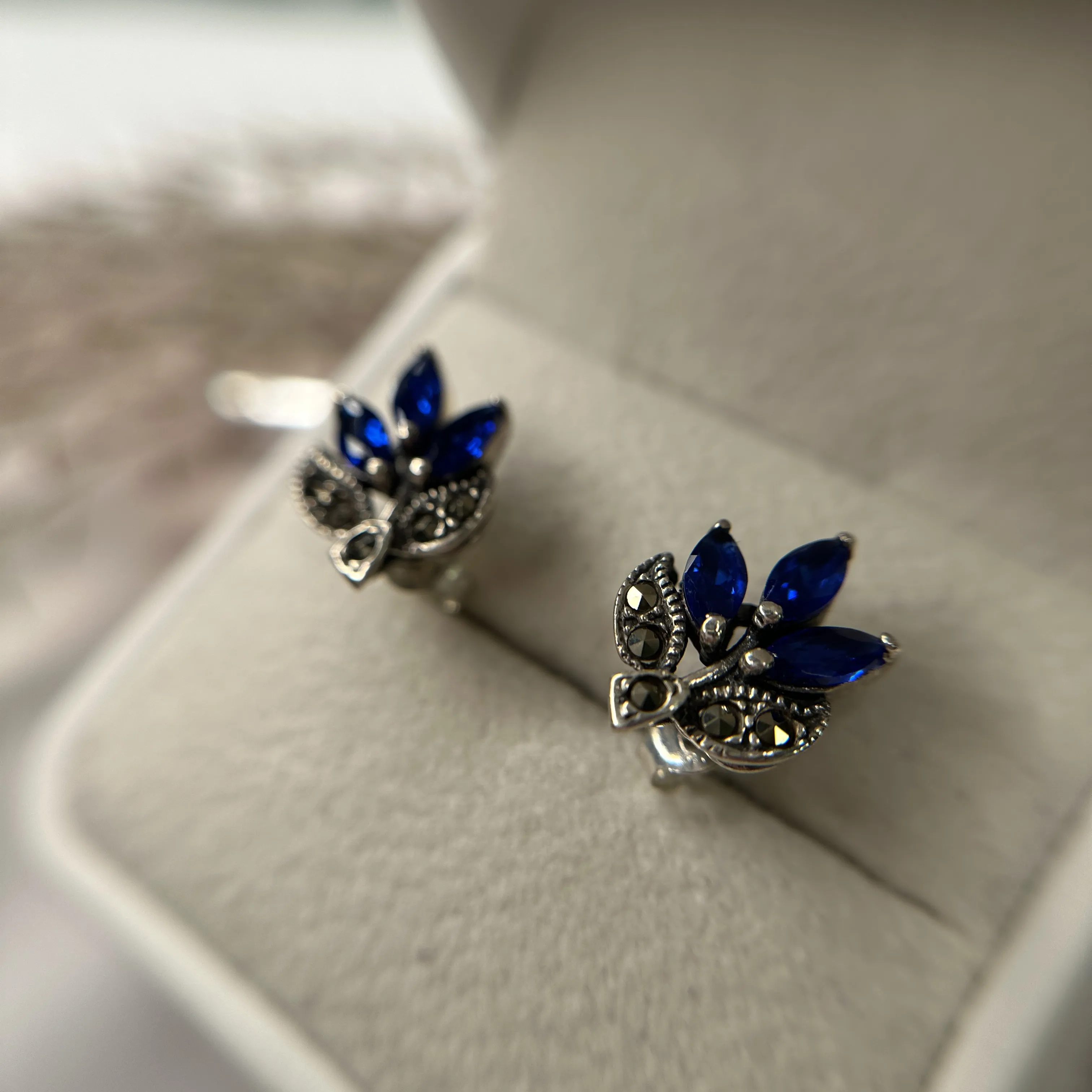 Cercei frunze din argint cu marcasite si cubic zirconia albastru. Inchizatoare cu surub.