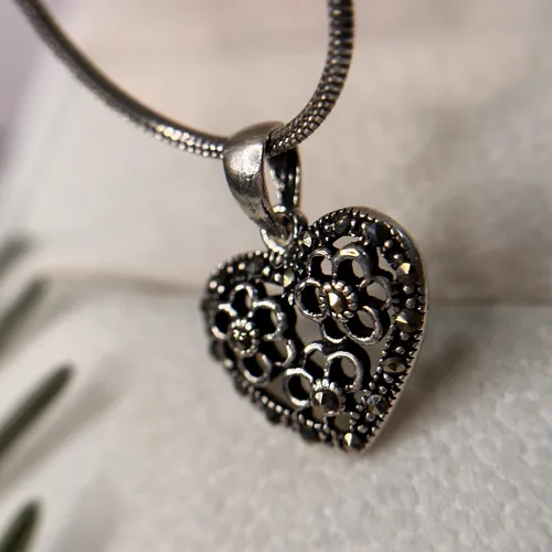Pandantiv model inimioara cu marcasite si floricele din argint. Cand ai speranta, traiesti, iubesti, vibrezi, daruiesti. Lantul nu este inclus in pret.