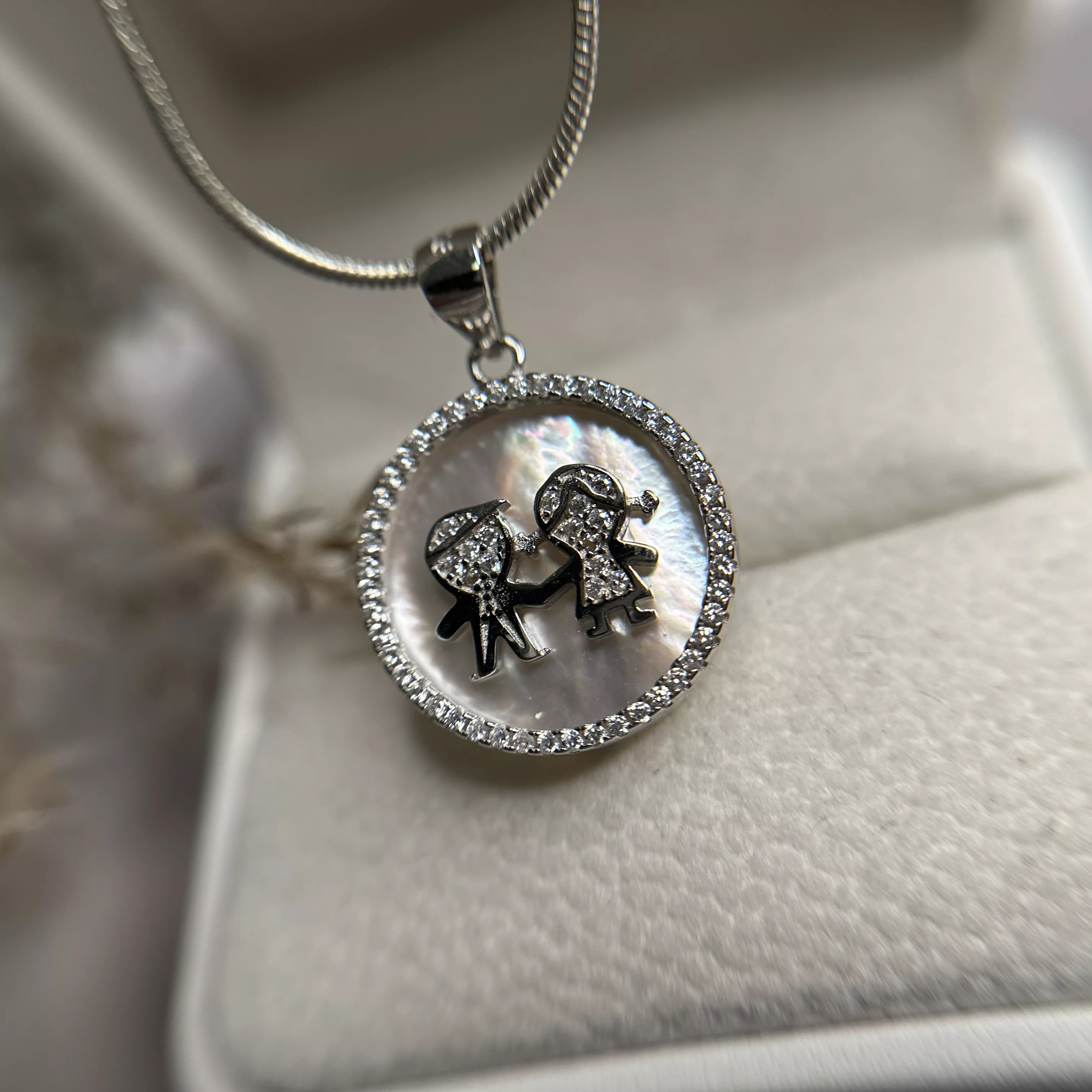 Pandantiv baiat si fata din argint cu sidef alb si zirconia alb. Lantul nu este inclus in pret.