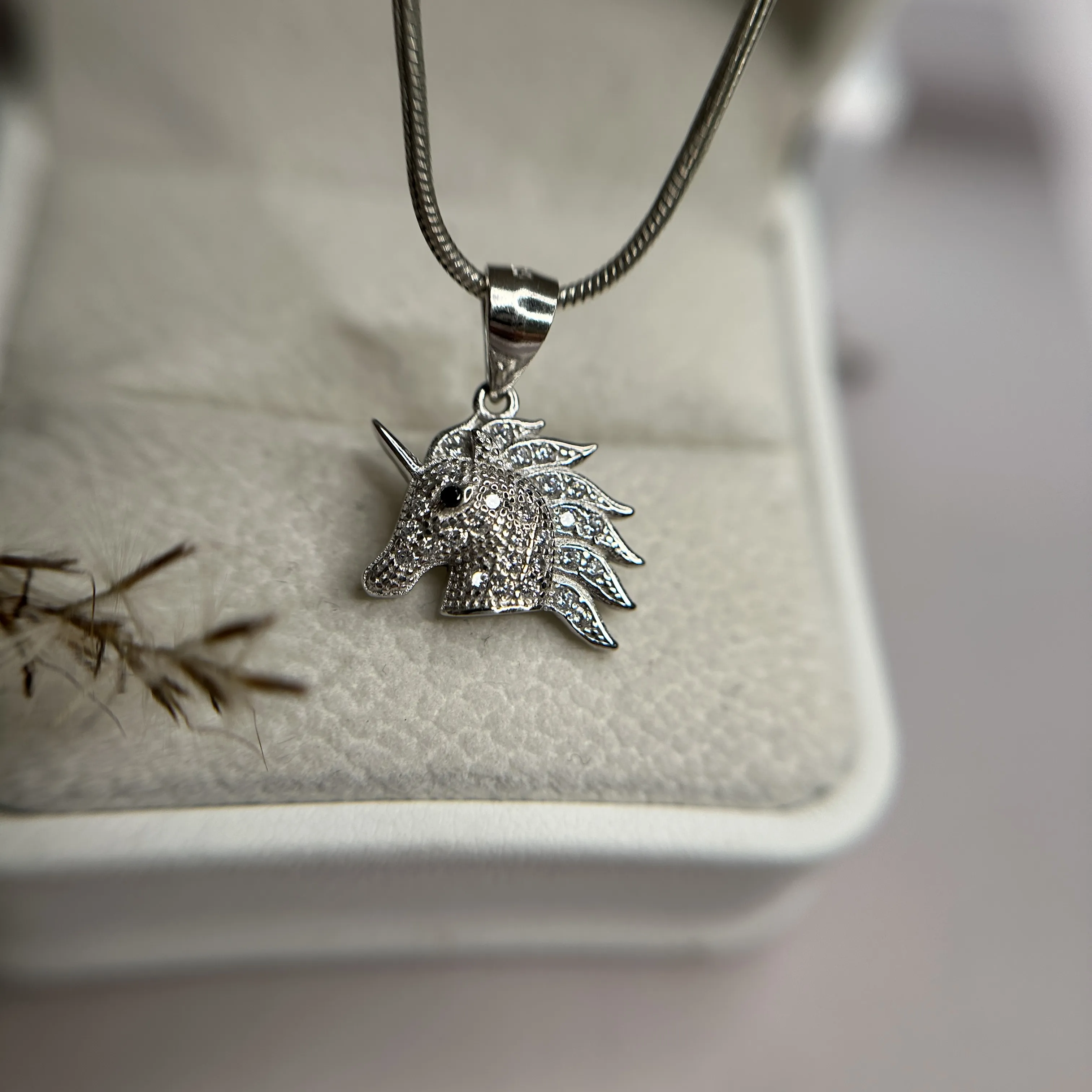 Unicorn calut din argint decorat cu pietre de cubic zirconia. Lantisorul nu este inclus in pret.