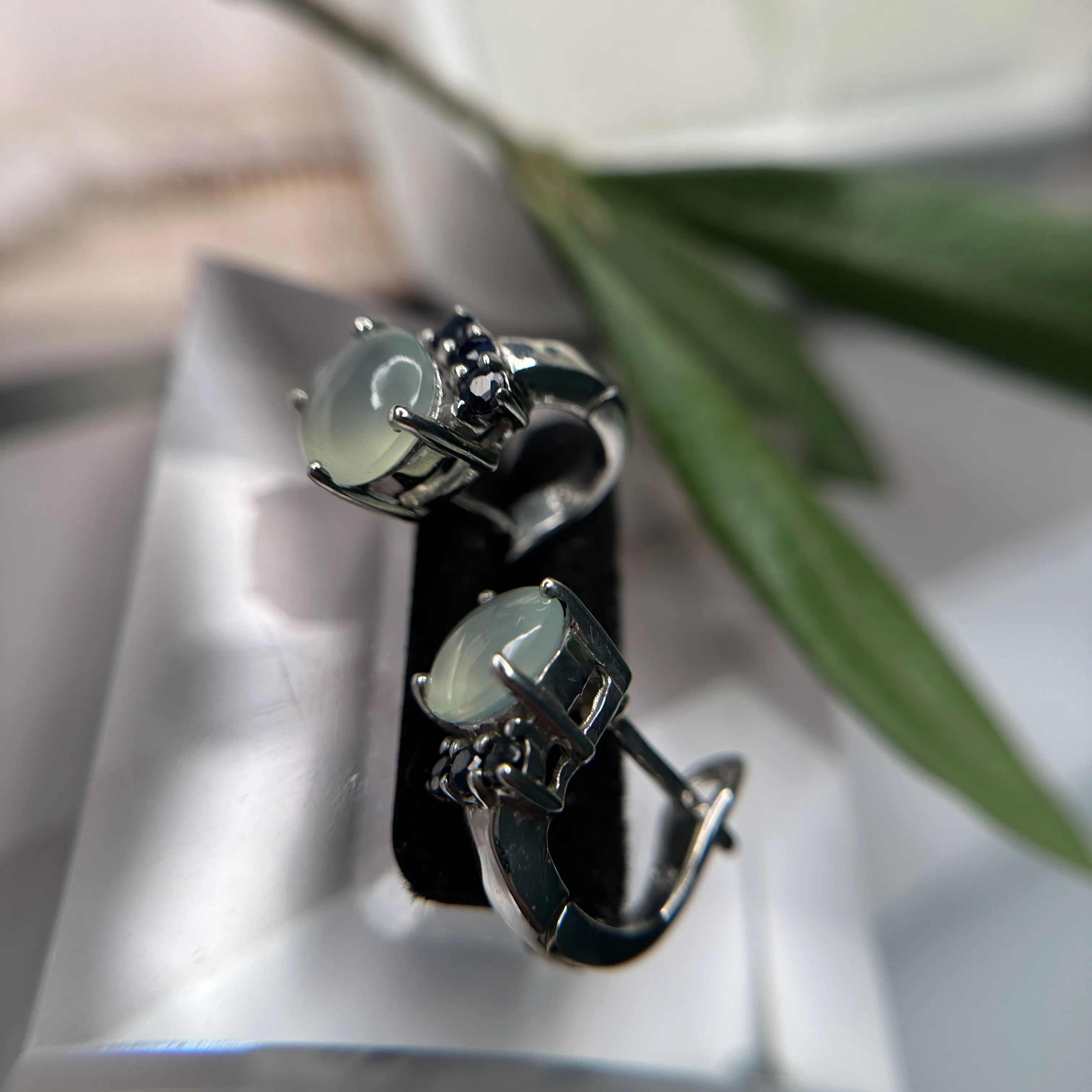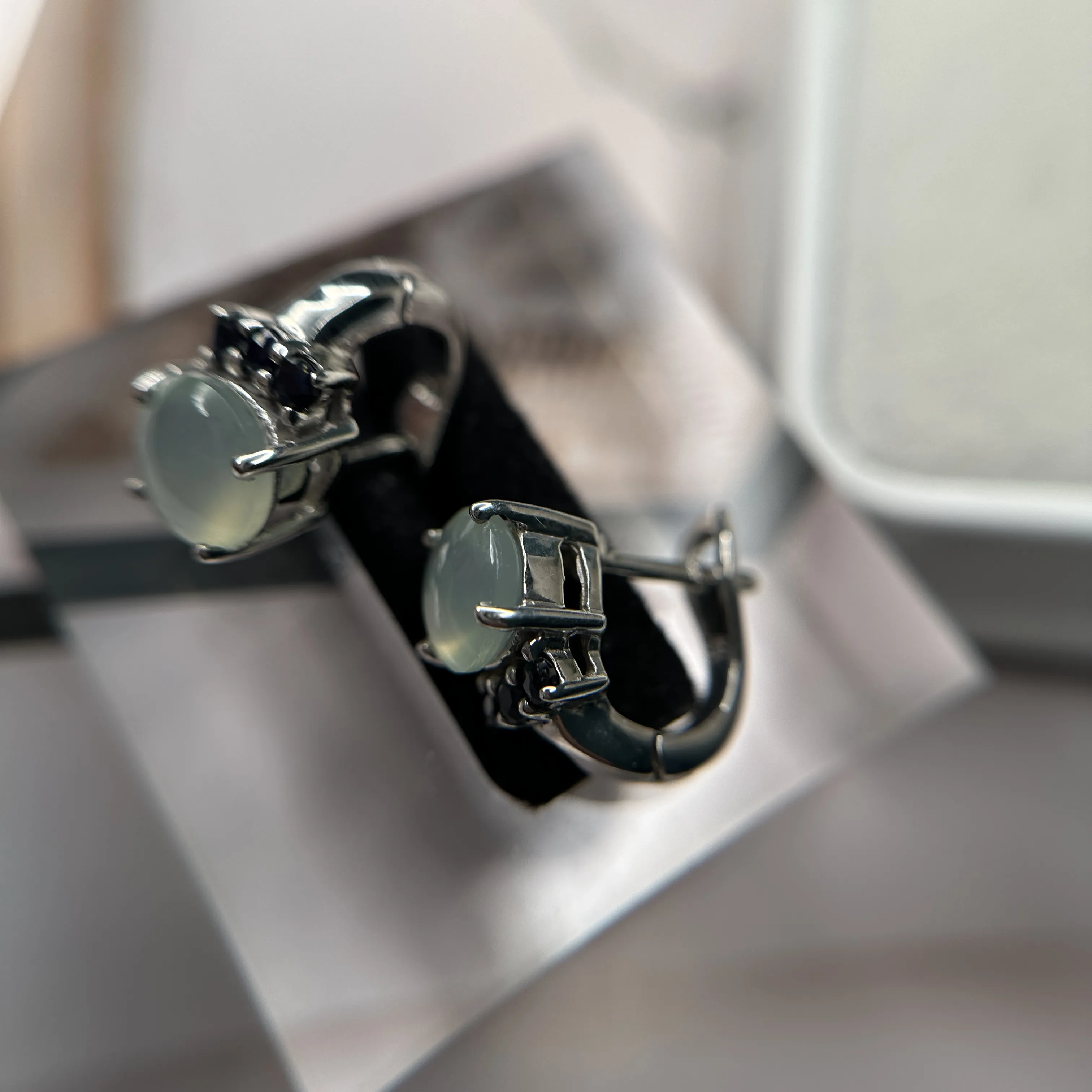 Cercei din argint cu spinel negru si calcedonie de culoare acvamarin vernil..