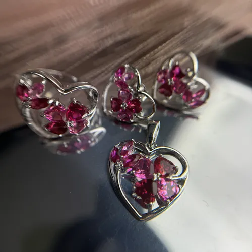 • Set inima din argint cu pietre roz: inel, cercei, pandantiv 15-1-i39182