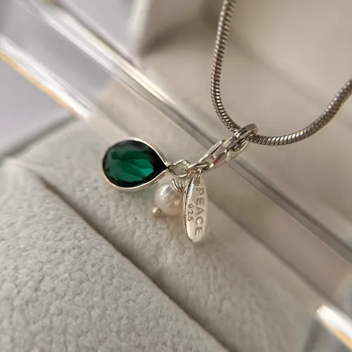 Un pandantiv din argint pentru bratara cu perluta de cultura si piatra verde. Pe placuta este gravat mesajul "PEACE". Pretul este pentru un pandantiv.